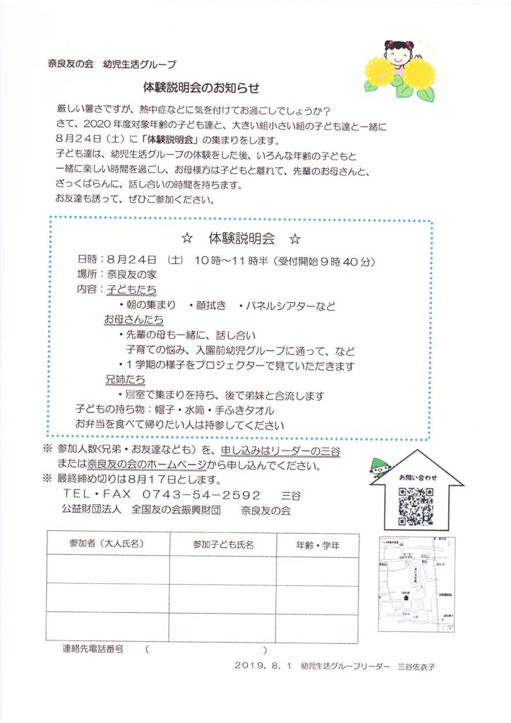 体験説明会のお知らせ 幼児生活グループ