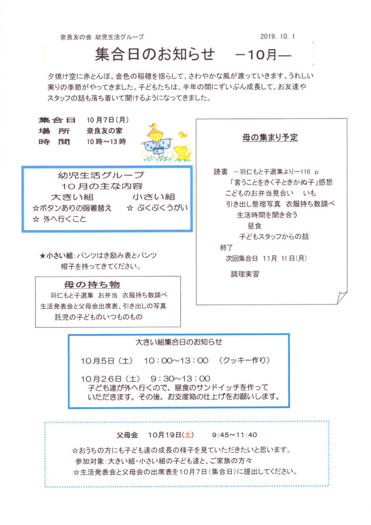 10月幼児生活グループ集合日のお知らせ