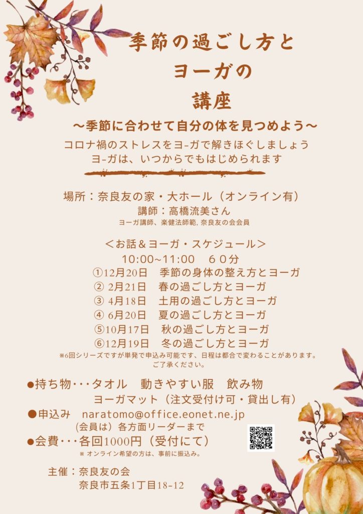 12月19日 季節の過ごし方とヨーガの講座 参加者募集中!