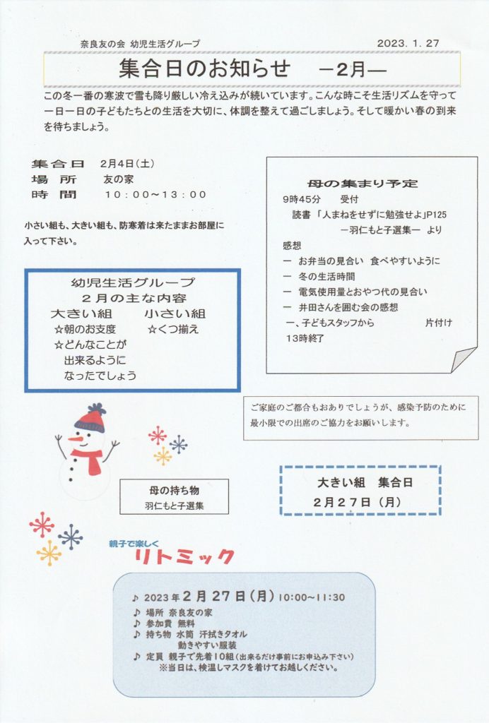 2月幼児生活グループ集合日のお知らせ