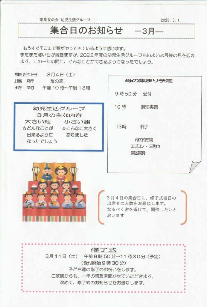 3月幼児生活グループ集合日のお知らせ