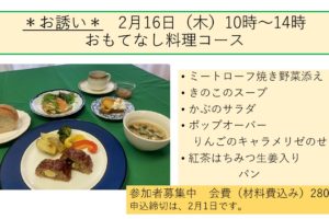 参加者募集中 お問い合わせは2月16日(木)10時~14時 おもてなし料理コース 会費2800円(材料費込み)