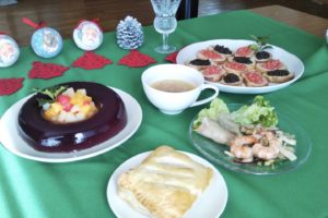 2021.12.19 教室 MaedaKimiko 12月おもてなし料理コース(第5回) おもてなし料理コース クリスマス編献立・チキンパイ ・レンズ豆のスープ ・キャロットラペとおれかのサラダ・海老ときのこのサラダ・ブルスケッタ2種・ワインゼリー