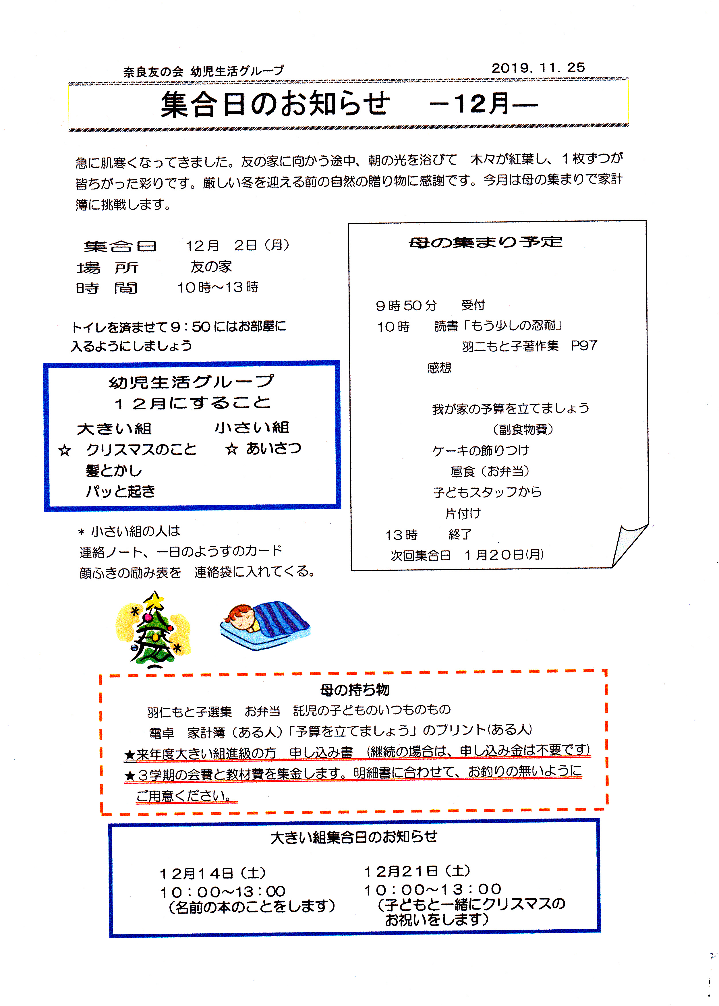 2019.11.29 会員 MaedaKimiko クリスマス祝会・12月例会 総リーダー 南岡 雅子当番・託児:委員会友の家大ホール(9時50分に着席して静かにお待ちください)10時~11時15分クリスマス礼拝 自由学園 高橋和也学園長聖書:ルカによる福音書15章11~24節イザヤ書第43章4~5…