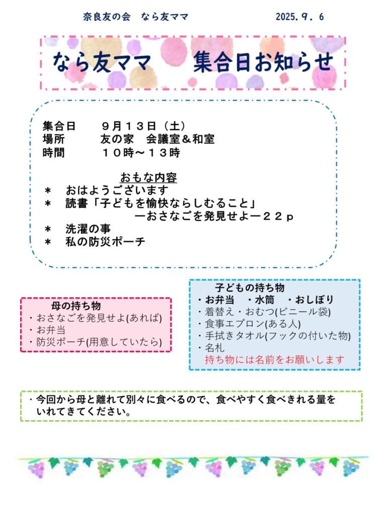 25.9月なら友ママ集合日のお知らせ